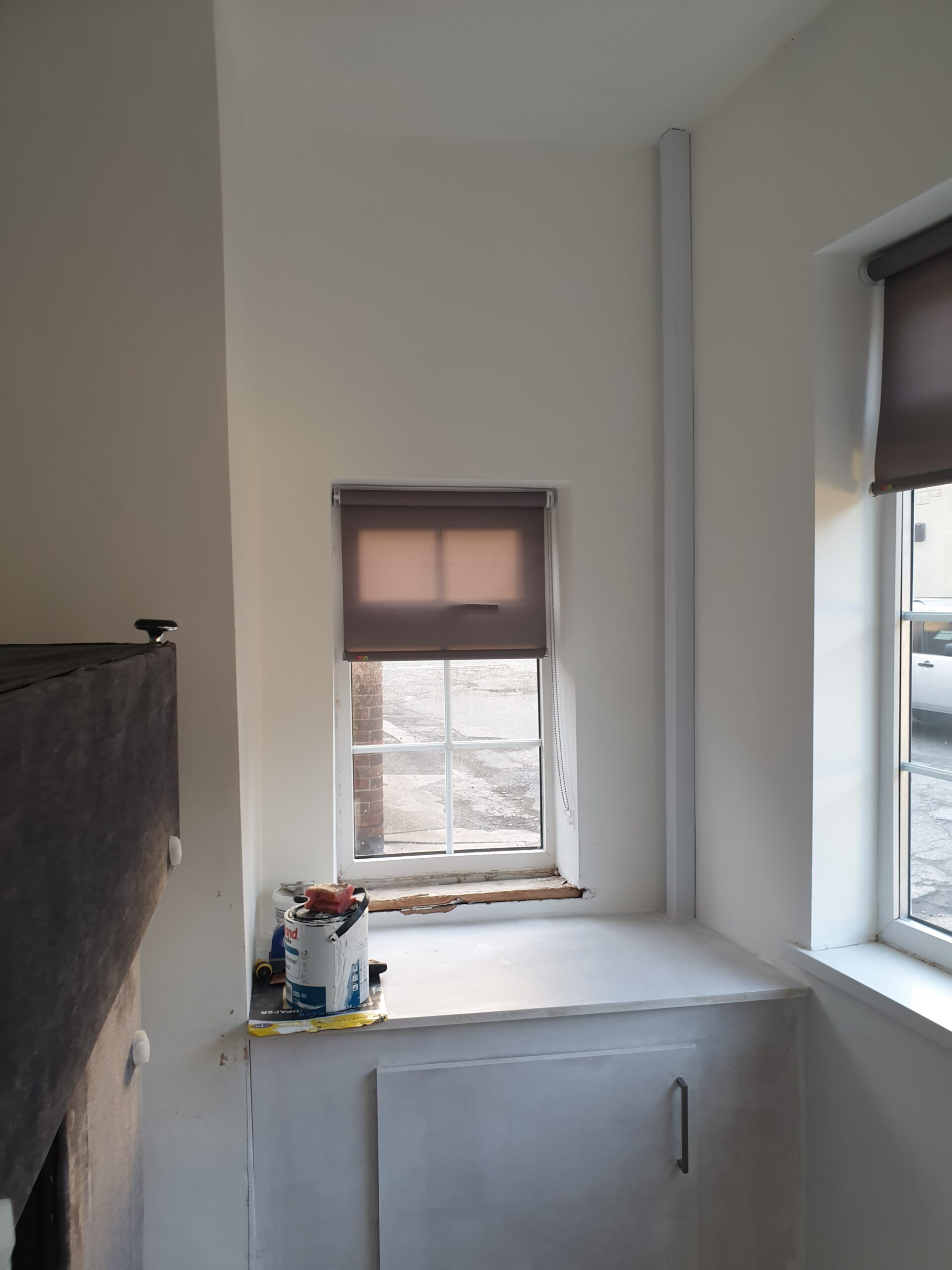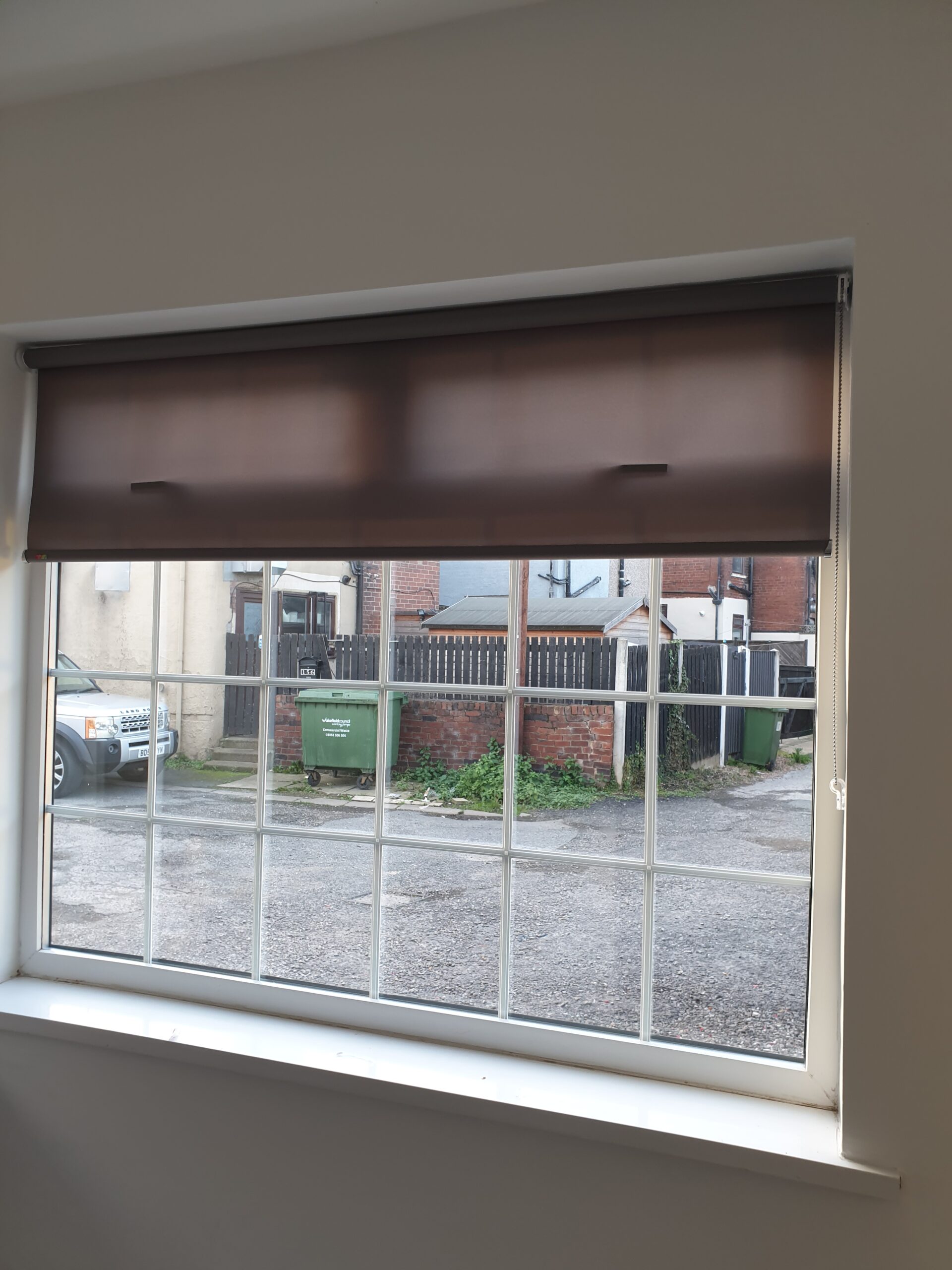 Modern building with bespoke blinds van parked outside.